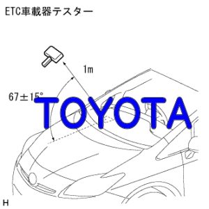 - ナビゲーションアンテナASSYから、仰角67±15°で車両前方上方に延びる線上で、ウインドシールドガラスから約1mの位置でETC車載器テスターを作動させる ((ETC車載器テスターとアンテナとの距離は、あくまでも目安である)